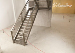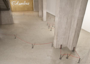 El mapa de Colombia es un espacio impenetrable acordonado por un discreto lazo de color rojo dentro de una exclusiva galería de arte del centro de Bogotá (Fig. X). El lazo pudo haber sido azul, amarillo, negro… pero el rojo es sangre, violencia y vida. Ese espacio vacío es la negación de un territorio que nos pertenece y al que el público no tiene acceso. La  negación al público de ese espacio imaginario que es Columbia.