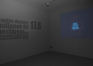 Los datos del audiovisual fueron extraídos de medios independientes como La Silla Vacía, Semana, Simco(Fig. x) Un audiovisual proyectado a manera de componente formativo dentro de un espacio inspirado en las salas/bóvedas del Museo del Oro de Bogotá, y obviamente la información que quería destacar era la que estaba ahí: una mezcla de datos sobre lo que concierne a la extracción de oro, carbón, etcétera, y testimonios de personas afectadas por ello. Algo así como: Columbia es rico en petróleo, carbón y oro, entre muchos otros recursos. En la actualidad, el 40% del territorio colombiano está concesionado o solicitado por empresas nacionales y multinacionales para realizar proyectos de extracción de minerales e hidrocarburos.